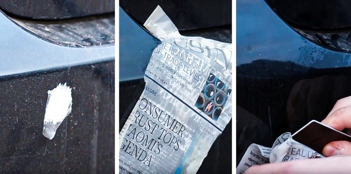 Coca-Cola là cách hữu ích và rẻ tiền để loại bỏ xỉn màu và rỉ sét của xe ô tô. Bạn chỉ cần phun Coca-Cola lên bề mặt rỉ sét, sau đó sử dụng bàn chải (hoặc bàn chải đánh răng nếu diện tích bị rỉ sét nhỏ hơn) để phá vỡ. Áp dụng và chà khi cần thiết. Đừng quên làm sạch bằng nước sau khi bạn hoàn thành.