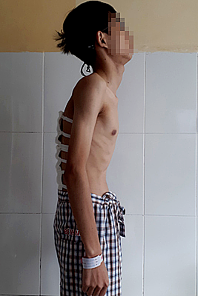 Anh đến khoa Phẫu thuật cột sống, Bệnh viện Trung ương Quân đội 108, khám từ tháng 5 trong tình trạng cột sống bị biến dạng nhiều năm, đi khuỳnh chân, cột sống gù gập chèn ép lồng ngực và ổ bụng. Bệnh nhân hay bị đầy bụng, ăn khó tiêu, đau tức ngực, thi thoảng khó thở.