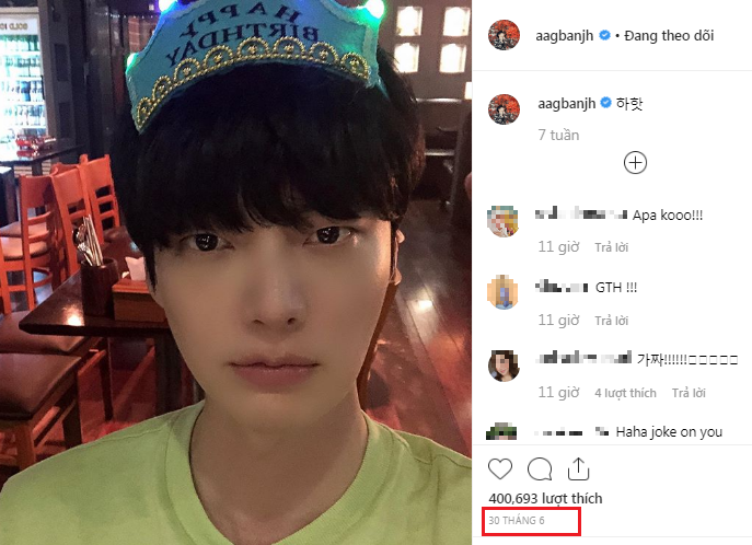 Trên Instagram, Ahn Jae Hyun cũng chia sẻ hình ảnh cùng thời điểm ngày 30/6, mặc chiếc áo có màu giống trong bữa tiệc sinh nhật.