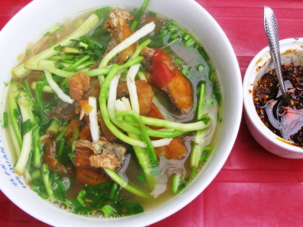 Bún cá đúng như tên gọi, có 2 thành phần chính là bún gạo và cá chiên giòn ăn kèm với nhiều loại rau thơm và gia vị. Nước dùng từ xương lợn hầm ngọt ngào có màu đỏ của cà chua chín khiến món ăn tăng thêm sự hấp dẫn. Thực khách có thể lựa chọn bánh đa khô hoặc sợi miến thay cho bún gạo khi gọi món.