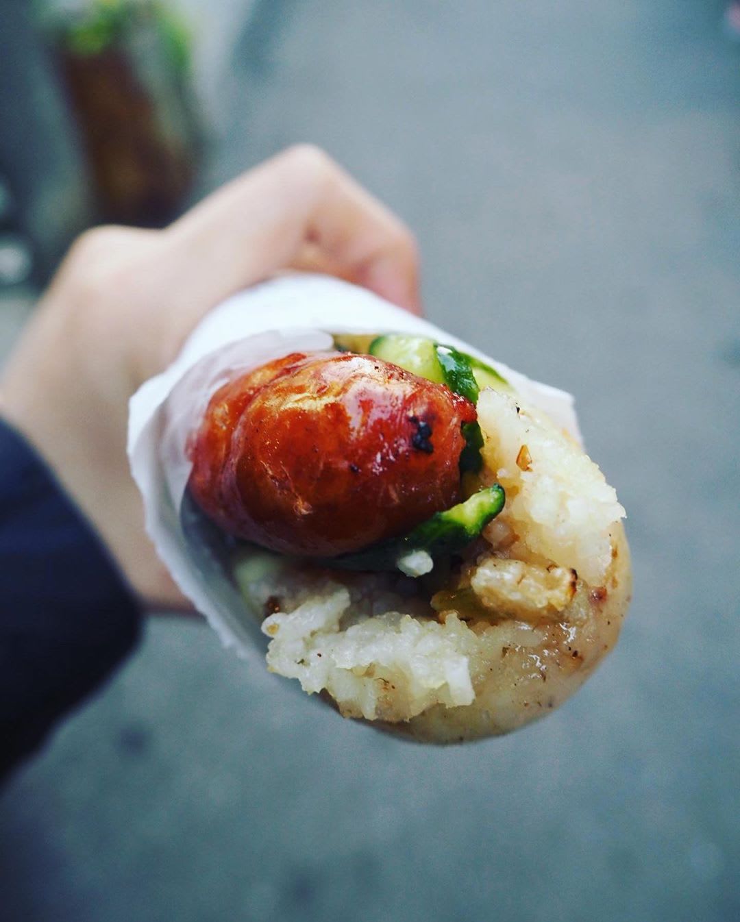 Đây là món ăn vặt thú vị gồm xúc xích ăn kèm với cơm nếp. Món ăn được bán tại hầu hết các quán ăn vặt ven đường ở các chợ đêm, bạn có thể vừa đi vừa thưởng thức nó với hương vị cay của hạt tiêu đen và vị thơm ngọt của xúc xích.