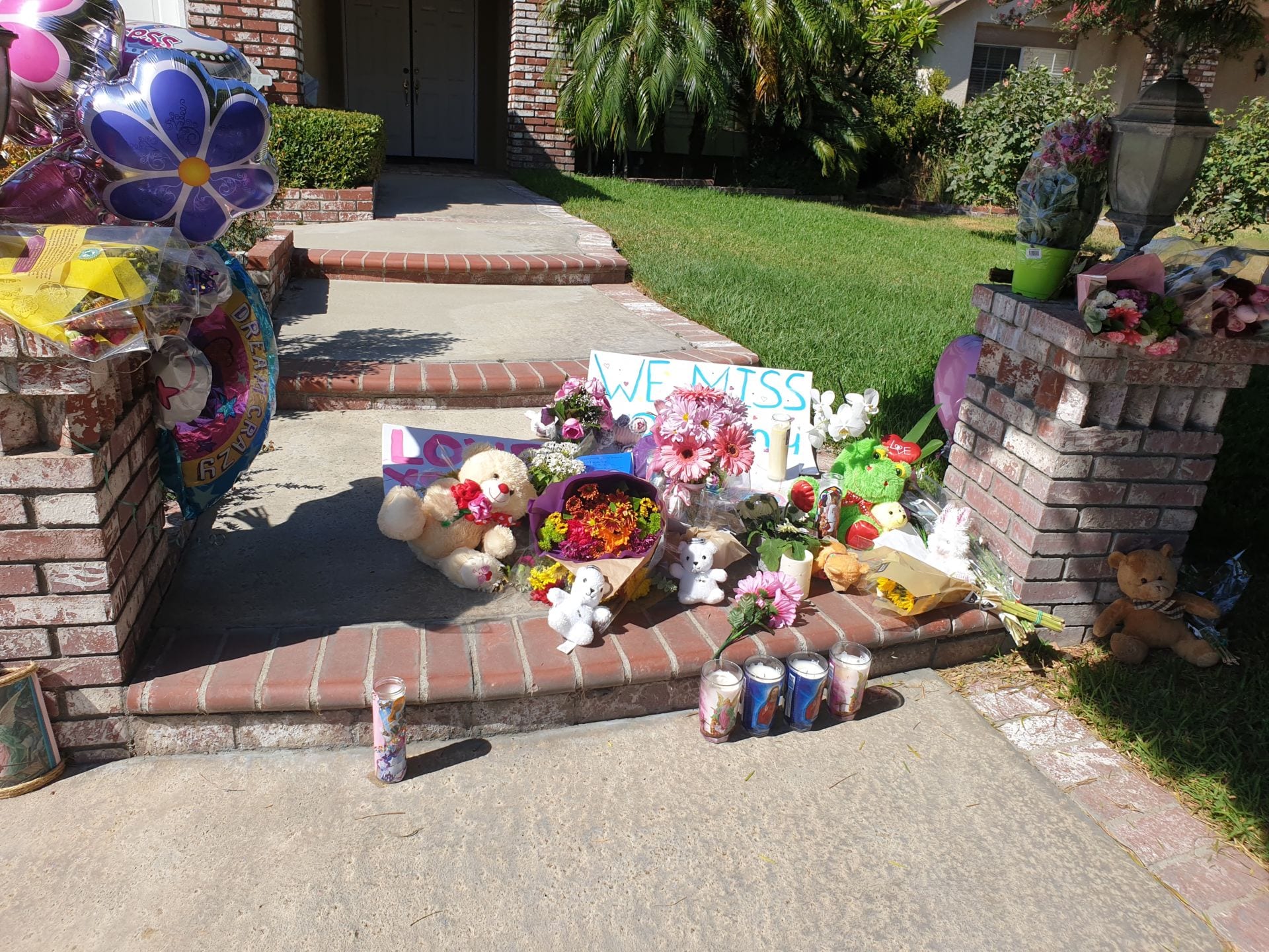Hoa và gấu bông tưởng nhớ hai cô gái nhỏ. (Hình: Đằng-Giao/Người Việt)