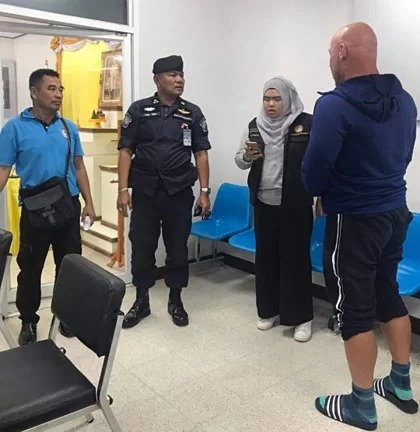 Roger (áo xanh, ngoài cùng bên phải) tại đồn cảnh sát Thái Lan sau khi xảy ra va chạm với nam du khách Anh. Ảnh: Metro.