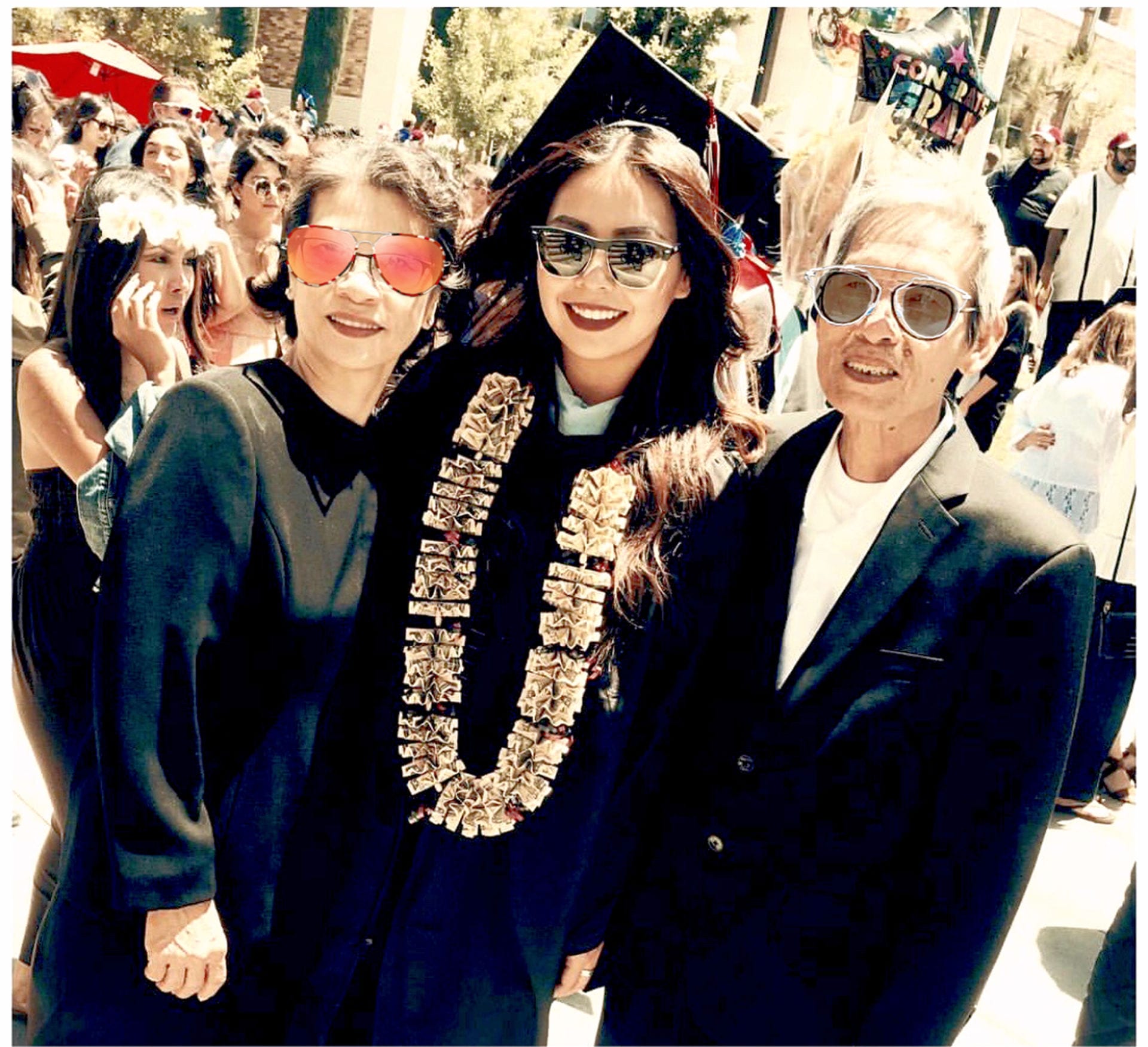 Tiffany cùng cha mẹ hạnh phúc trong lễ tốt nghiệp cao học ngành giáo dục tại đại học Chapman University. (Hình: Nhân vật cung cấp)