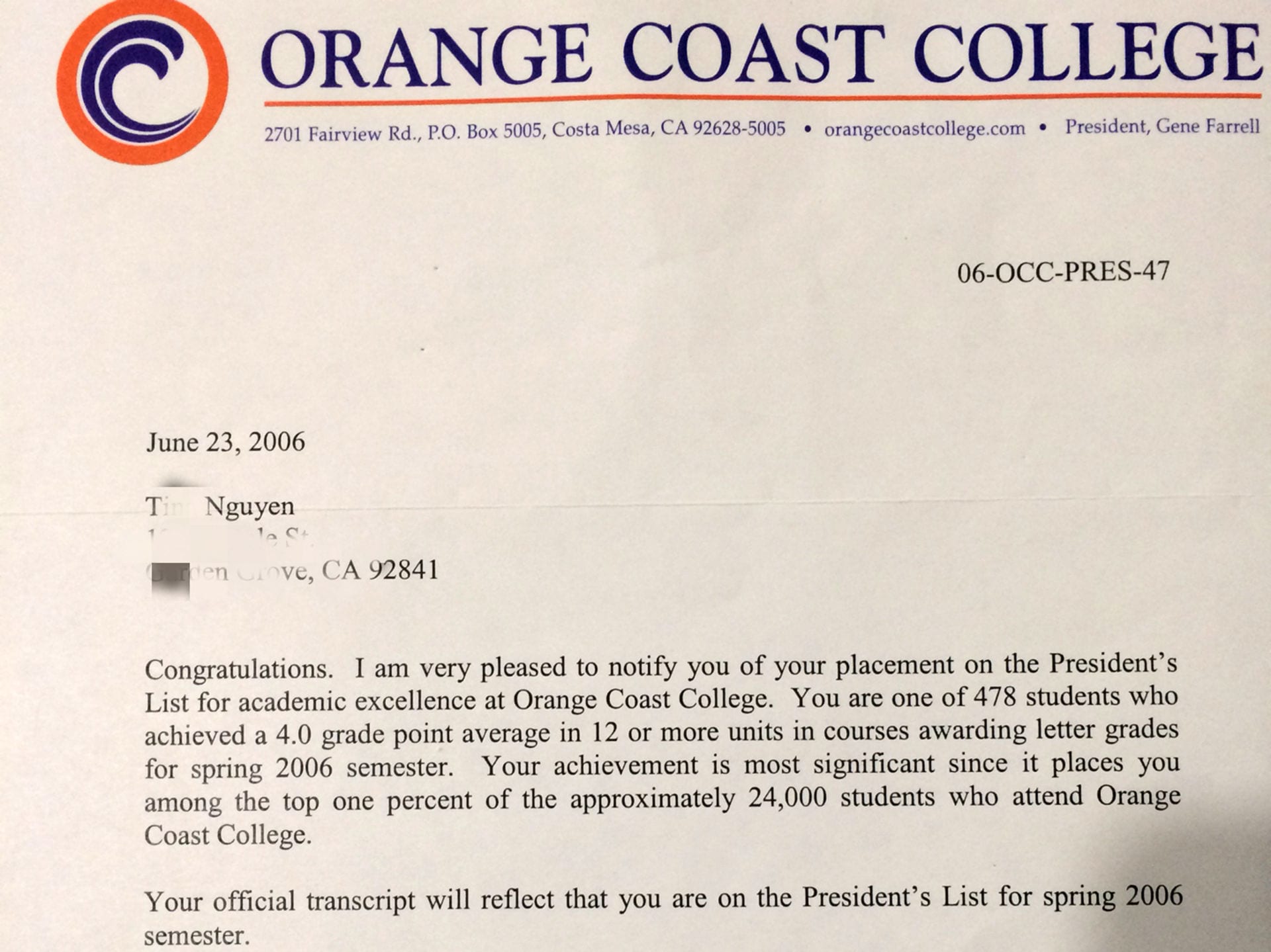 Lá thư của trường Orange Coast College cho thấy Tiffany là một trong 478 sinh viên đạt điểm tối đa 4.0 trong khi trường có 24,000 sinh viên. (Hình: Nhân vật cung cấp)