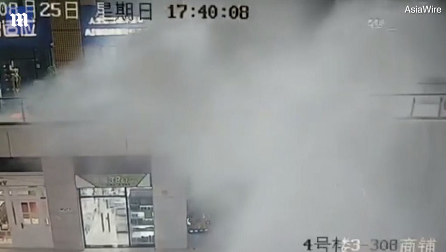 Theo Daily Mail, vụ việc người phụ nữ bị nước hất văng xảy ra tại trung tâm thương mại Huixing ở thành phố Đông Hoản, tỉnh Quảng Đông, Trung Quốc, vào khoảng 17h40 ngày 25/8 giữa lúc khu vực này đang hứng chịu cơn bão Bailu. (Nguồn ảnh: Daily Mail/AsiaWire)