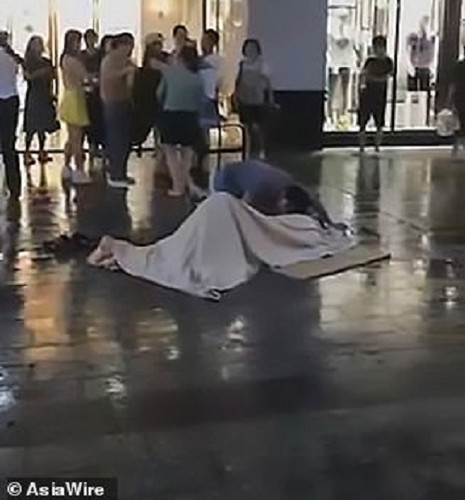 Một khách nữ đang đi trong TTTM bất ngờ gặp sự cố. Cô đã bị nước từ cơn bão làm ngã, kéo lê trong trung tâm. Nhiều người sau đó đã giúp cô thoát khỏi sự cố đáng tiếc này.