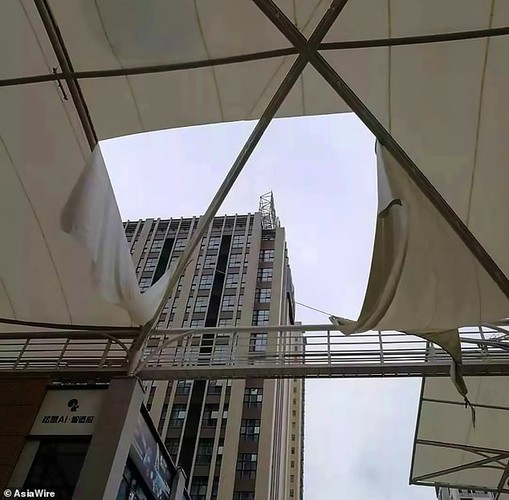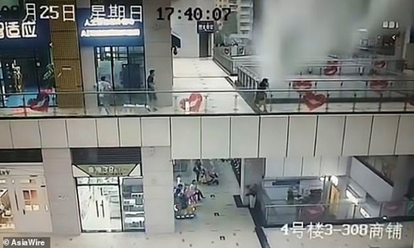Khi đó, phần mái phủ bằng vải bạt của trung tâm này đã bị thủng, khiến một lượng nước lớn trút xuống trúng người phụ nữ đang đi mua sắm ở tầng hai của trung tâm.