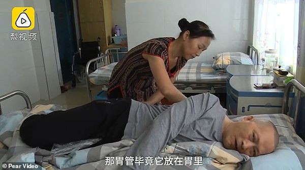 Chị Zhang cho biết, để cho chồng ăn, chị đã phải cẩn thận bỏ thức ăn vào miệng của chồng rồi nhẹ nhàng ấn lưỡi để đồ ăn trôi xuống.