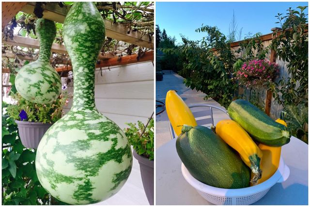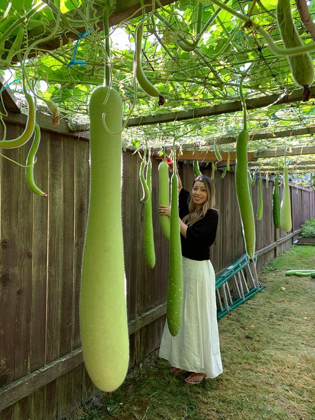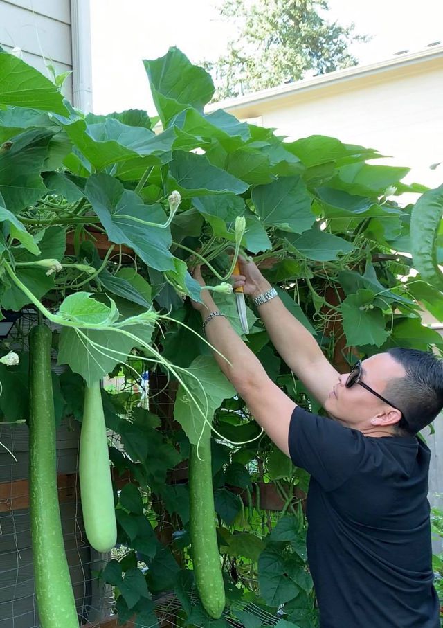 Đa phần các loại cây, trái trong khu vườn của anh Nhatan Bui là những giống cây có nguồn gốc từ Việt Nam như: rau muống, cải bẹ, rau thơm, hành lá, tía tô và các loại quả như: táo, mận, hồng giòn… Trong đó ấn tượng nhất là giàn bầu sai lúc lỉu, mỗi quả dài cả mét, nặng tới vài kg/ trái.