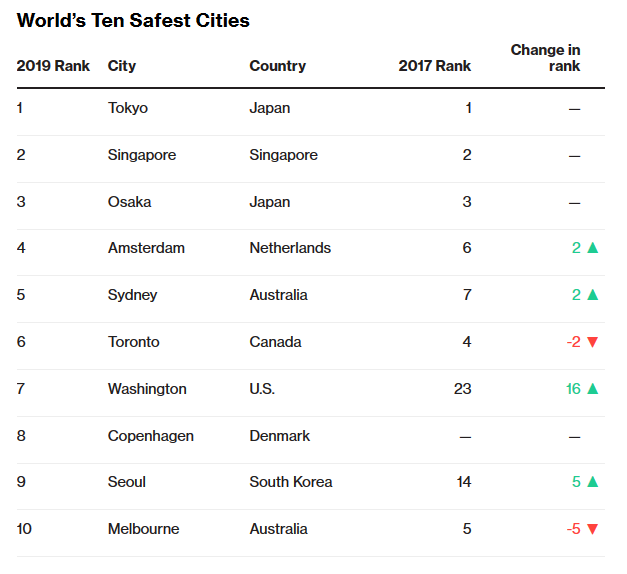 Theo đánh giá của Economist Intelligence Unit, Tokyo, Nhật Bản, tiếp tục được vinh danh là thành phố an toàn nhất thế giới. Singapore và Osaka tiếp tục duy trì thứ hạng của họ như năm ngoái ở vị trí thứ 2 và thứ 3. Riêng Hồng Kông, Trung Quốc, bị tụt từ vị trí thứ 9 trong năm trước xuống thứ bậc 20 trong bảng xếp hạng năm nay bởi tình hình bất ổn kéo dài.
