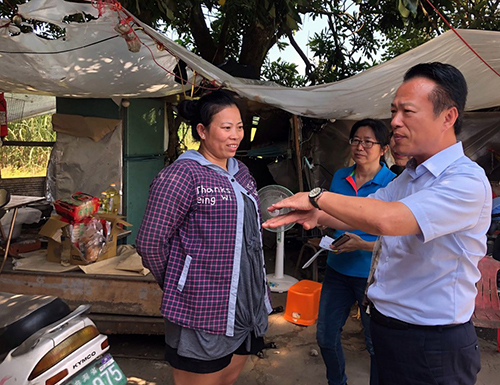 Bà Nguyễn (trái), mẹ của Huang, nói chuyện với các quan chức huyện Gia Nghĩa tại căn lều tạm bợ hôm 1/9. Ảnh: CNA.
