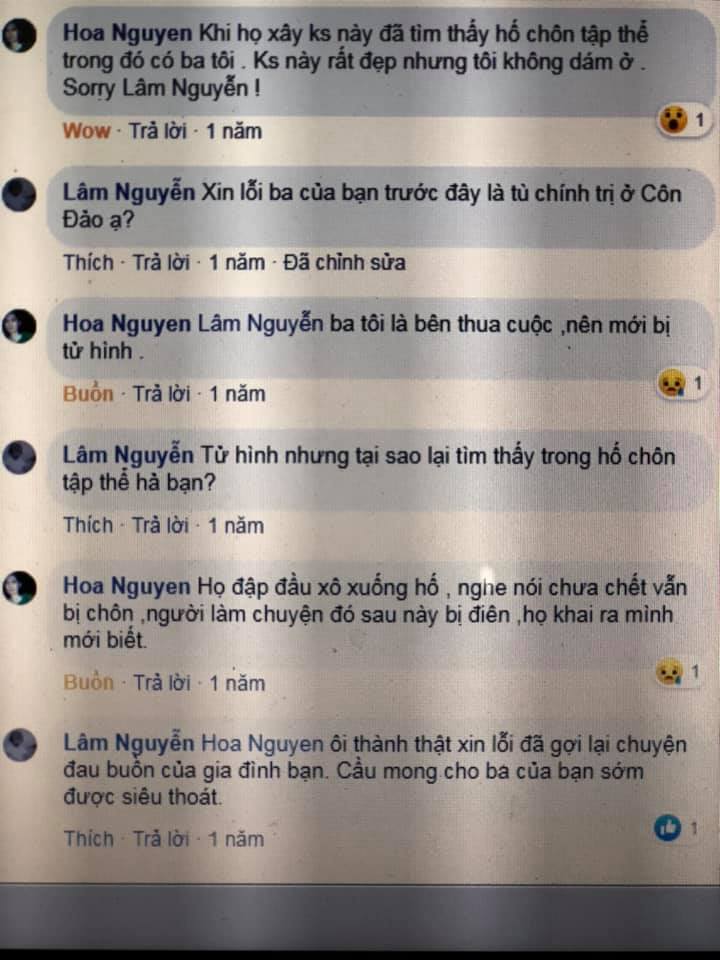 – Khi họ xây nơi này đã tìm thấy hố chôn tập thể trong đó có ba tôi. Ks này rất đẹp nhưng tôi không dám ở. Sorry Lâm Nguyễn!