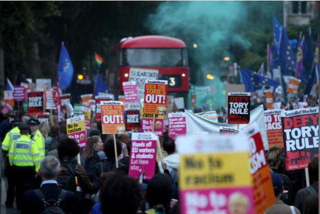 Những người biểu tình chống Brexit giương cao các biểu ngữ bên ngoài tòa nhà Quốc hội Anh ngày 3-9. Ảnh: REUTERS