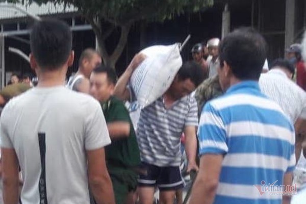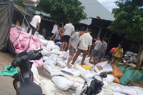 Lực lượng công an, biên phòng, dân quân và người dân địa phương đã kịp thời có mặt, cùng nhau thu gom gạo bị đổ rồi bốc vác lên xe tải giúp tài xế.