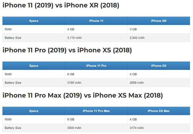 Thông tin về RAM và dung lượng pin của 3 chiếc iPhone mới. Ảnh: PhoneArena.