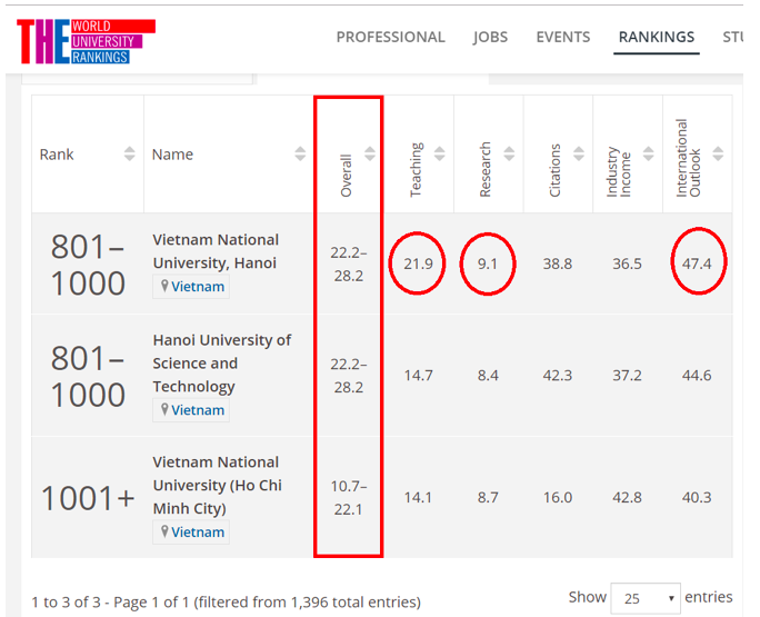 Bảng 1. Thứ hạng các trường ĐH của Việt Nam trong Bảng xếp hạng THE thế giới. (Nguồn: