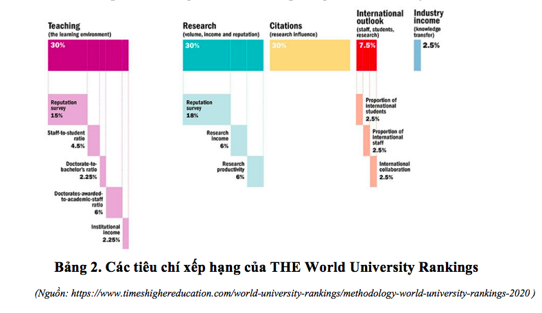 2) Nghiên cứu (số lượng; thu nhập; uy tín) với trọng số 30%, bao gồm: kết quả khảo sát về uy tín nghiên cứu khoa học (18%), thu nhập từ nghiên cứu (6%), và năng suất nghiên cứu (6%).