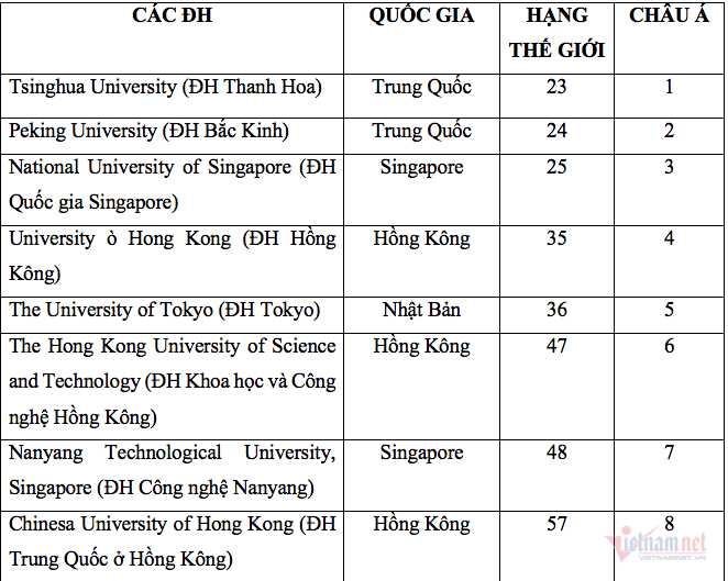 Tốp 20 các trường châu Á trong bảng xếp hạng.