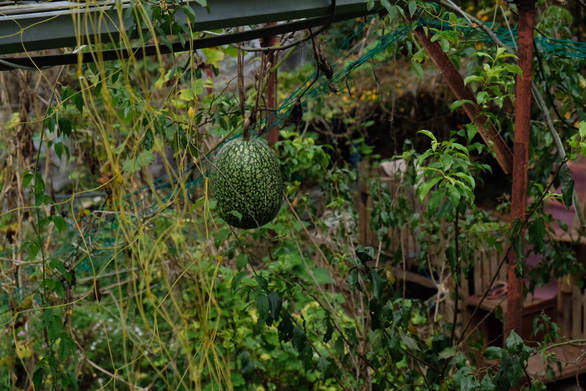 Trái dưa vi cá mọc tươi tốt và ra trái rất lớn trong vườn nhà anh Tân mà không cần phân thuốc. Anh kể nhiều người đã xin hạt về trồng, cây mọc nhưng không có trái. Khi tìm hiểu anh mới biết phần lớn họ trồng trong nhà lưới không có sinh vật thụ phấn nên không có trái - Ảnh: VŨ THỦY