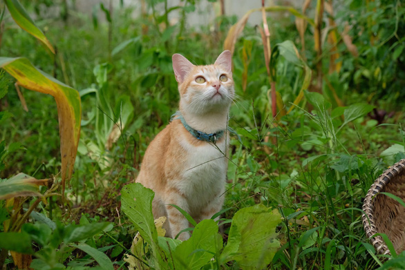 Những chú mèo thường ăn những loại cỏ thảo mộc trong vườn nhà anh vào sáng sớm. Nhưng anh thường xuyên phải xích giữ để chúng không chạy sang vườn nhà kính xung quanh nhiều thuốc trừ sâu và thuốc hóa học. Trước đó có hai con chó, hai con mèo đã chết sau khi chạy sang các vườn khác - Ảnh: VŨ THỦY