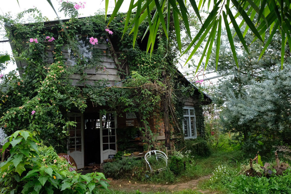 Căn nhà gỗ xinh xắn với hoa thường xuân và nhiều khu vực để dựng lều ngay trong khu vườn của anh - Ảnh: VŨ THỦY