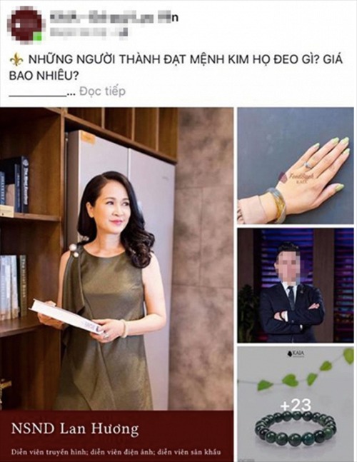 Trên trang cá nhân, NSND Lan Hương vừa đăng dòng trạng thái bức xúc khi một nhãn hàng tự ý lấy hình ảnh của cô đăng lên Facebook để quảng cáo bán vòng phong thuỷ đeo tay. Cô viết: "Xin lỗi, cái đá quý này ở đâu mà lại có hình tôi quảng cáo thế này. Tôi không phải mệnh kim. Nhãn hàng uy tín gì lại gian dối thế. Bàn tay trong ảnh xấu quá, không phải tay tôi. Tôi đề nghị nhãn hàng gỡ ngay".