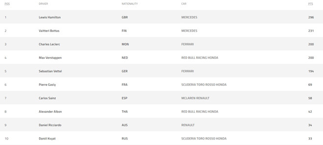Lewis Hamilton vẫn dẫn đầu trên bảng xếp hạng với khoảng cách khá xa với các tay đua Ferrari. Ảnh: Formula1.