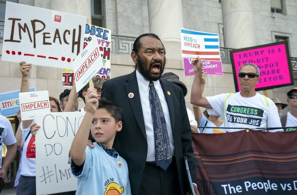 Hạ nghị sĩ đảng Dân chủ Al Green, bang Texas, tham gia cùng các nhà hoạt động ủng hộ luận tội để kêu gọi Quốc hội bãi nhiệm Tổng thống Donald Trump khỏi chức vụ, ở Đồi Capitol, Washington, ngày 23/9. Ảnh: AP.