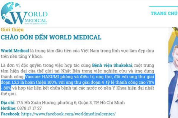 Trao đổi với **********, TS Nguyễn Hồng Vũ, Viện Nghiên cứu Ung thư City of Hope (Mỹ) cho biết, ông và các cộng sự trong tổ chức Ruy Băng Tím đã kiểm tra tất cả thông tin từ website và Facebook của trung tâm World Medical, đi đến khẳng định, tất cả những thông tin quảng cáo sử dụng vắc xin Hasumi để phòng và điều trị ung thư là lừa đảo.