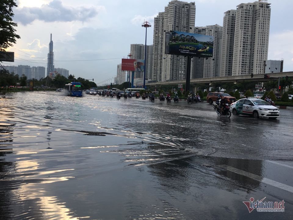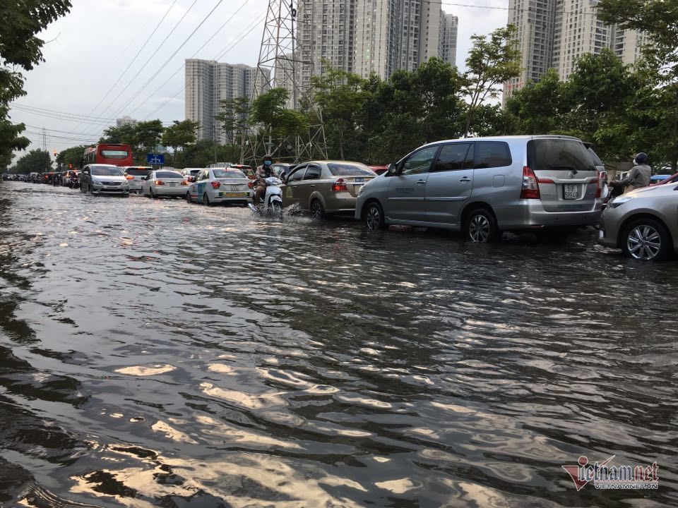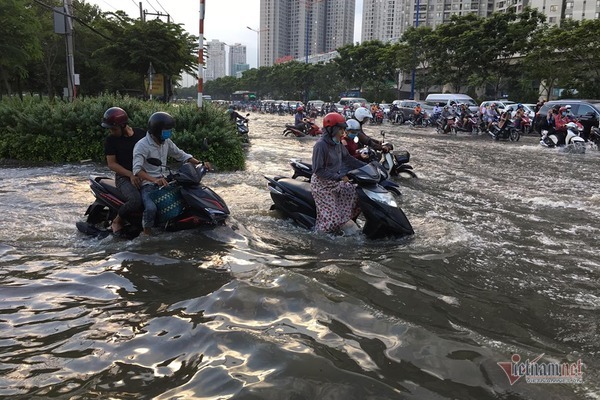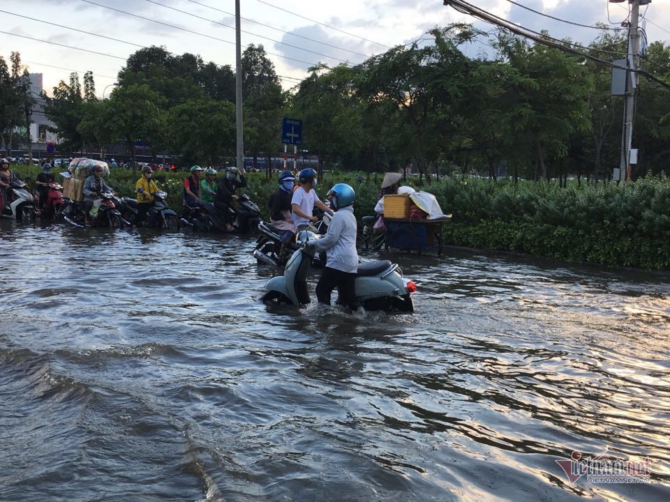 Ghi nhận, địa bàn quận 2 là nơi chịu ảnh hưởng nặng nhất của triều cường. Hàng loạt tuyến đường như Xa lộ Hà Nội, đường Song Hành, Lương Định Của ngập nặng có nơi hơn nữa mét khiến hàng loạt xe máy chết máy phải dẫn bộ.