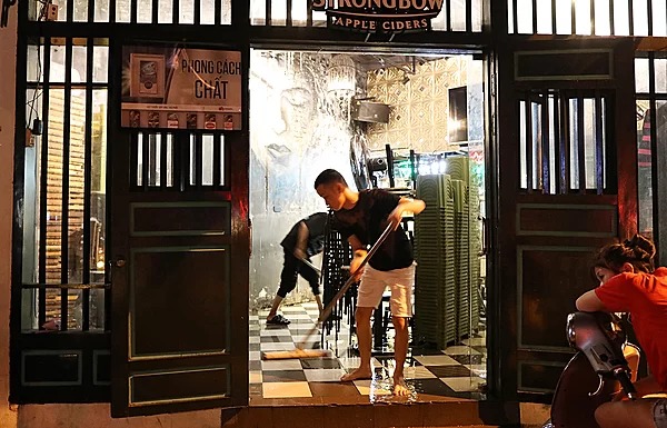 Một quán bia ở góc phố cổ Tạ Hiện dọn dẹp lúc 12h đêm khi khách du lịch nước ngoài bắt đầu có nhu cầu giải trí. Ảnh: Ngọc Thành.