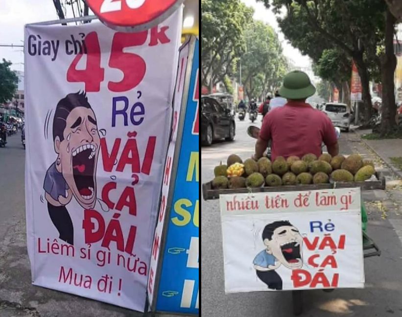 Một đôi giày, giá chỉ 45k (bốn mươi lăm ngh́n đồng), đè bẹp cả liêm sỷ và cái sự rẻ mạt khiến người ta coi rằng sự thích thú với (thông tin về mức giá) món đồ sẽ làm họ văi cả đái ra một cách mất kiểm soát. Họ sẽ vứt đi liêm sỷ để mua ngay nó cho ḿnh.