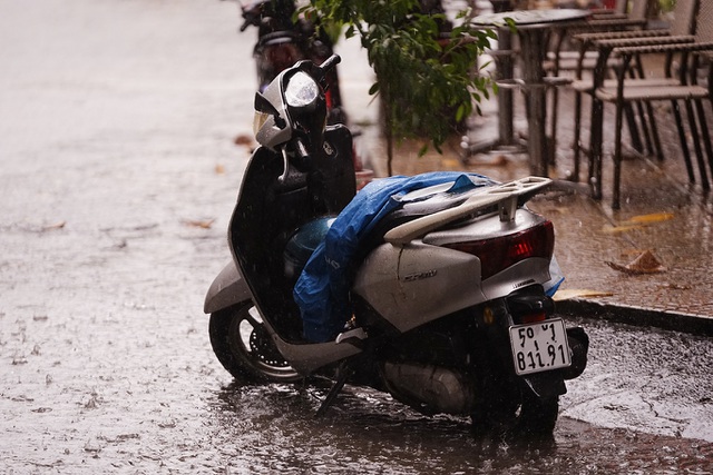 “Định tấp vào quán cà phê để đợi tạnh mưa rồi về mà không còn chỗ đậu xe nên dựng dưới lòng đường luôn, mưa lớn quá”, ông Quan Ngọc Thành, ngụ quận 5, bị dính mưa ở Phú Nhuận chia sẻ.
