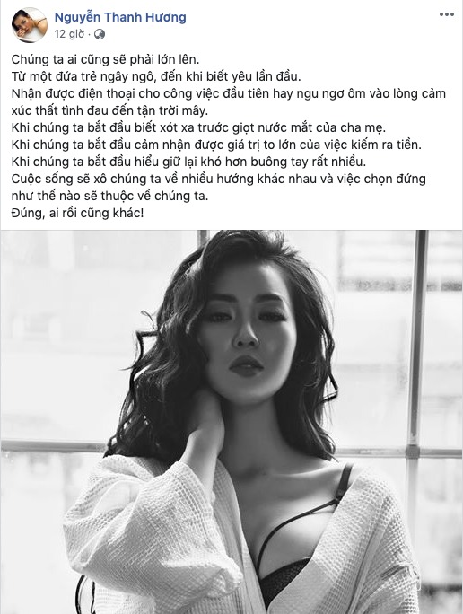 Nữ diễn viên còn thường có những status tâm trạng: “Chúng ta ai cũng sẽ phải lớn lên. Từ một đứa trẻ ngây ngô, đến khi biết yêu lần đầu. Nhận được điện thoại cho công việc đầu tiên hay ngu ngơ ôm vào lòng cảm xúc thất tình đau đến tận trời mây. Khi chúng ta bắt đầu biết xót xa trước giọt nước mắt của cha mẹ. Khi chúng ta bắt đầu cảm nhận được giá trị to lớn của việc kiếm ra tiền. Khi chúng ta bắt đầu hiểu giữ lại khó hơn buông tay rất nhiều. Cuộc sống sẽ xô chúng ta về nhiều hướng khác nhau và việc chọn đứng như thế nào sẽ thuộc về chúng ta. Đúng, ai rồi cũng khác!”.