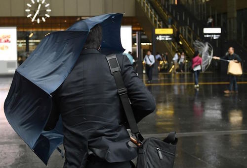 Người dân đi dưới mưa gần ga Osaka. (Ảnh: Reuters/Annegret Hilse)