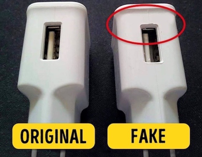 Sự khác nhau giữa “củ sạc” chính hãng (bên trái) và hàng nhái (bên phải)