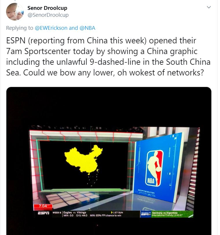 Việc sử dụng bản đồ "đường lưỡi bò" diễn ra sau khi có thông tin rằng Chuck Salituro, Giám đốc tin tức cấp cao của ESPN, đã "yêu cầu mọi cuộc thảo luận về câu chuyện Daryl Morey đều phải tránh đề cập các vấn đề chính trị liên quan đến Trung Quốc và Hong Kong, và thay vào đó, hãy tập trung vào các vấn đề liên quan đến bóng rổ".