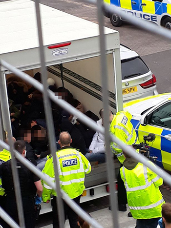 Nhóm người Việt bị cảnh sát phát hiện trên thùng xe tải sau khi bỏ trốn khỏi tàu cá hôm 12/4. Ảnh: Cornwall Live