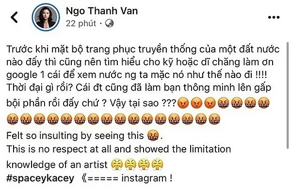 Giải thích về việc chỉ trích gay gắt Kacey Musgraves, "đả nữ" lý giải: "Tôi bức xúc trước hình ảnh kia là vì từ khi trở thành nhà sản xuất phim, sứ mệnh tôi đặt ra cho mình là quảng bá văn hóa Việt Nam đến quốc tế, thông qua điện ảnh và các dự án khác nhau, đơn cử như bộ phim Cô Ba Sài Gòn trước đây. Vì vậy khi thấy chiếc áo dài truyền thống được mặc một cách sai lệch, tôi cảm thấy rất phẫn nộ vì công sức bảo vệ chiếc áo dân tộc bị xúc phạm".