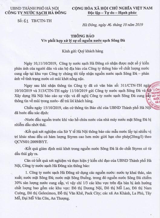 Người dân Hà Nội đang phải sử dụng nguồn nước ô nhiễm, nước nhiễm dầu thải từ công ty nước sạch sông Đà cung cấp. Công ty Nước sạch sông Đà hiện đang cung cấp trung bình khoảng 250.000 - 260.000 m3 nước mỗi ngày đêm cho người dân Hà Nội. Dưới đây là những khu vực bị ảnh hưởng phải dùng nước bẩn.