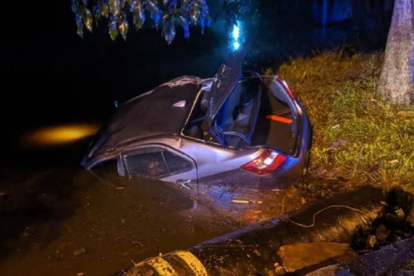 Xe của đôi nam nữ lao xuống mương nước trong lúc chạy trốn. Ảnh: Harian Metro