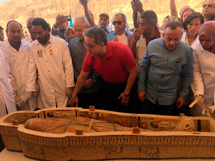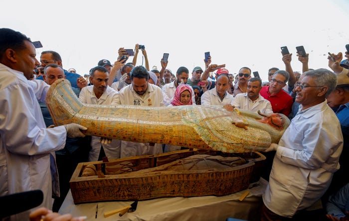 Các quan tài cổ được mở nắp vào hôm 19/10, một tuần sau khi chúng được khai quật tại nghĩa địa Asasif của Ai Cập, nơi thành phố cổ Thebes từng tồn tại.