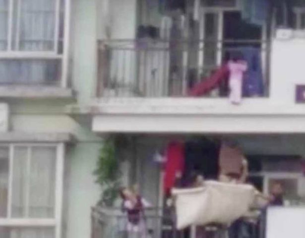 Một bé gái lơ lửng trên tầng 9 đang bám vào lan can ban công ở cách mặt đất khoảng 27m, hàng xóm phát hiện đã mang chăn ra hứng.