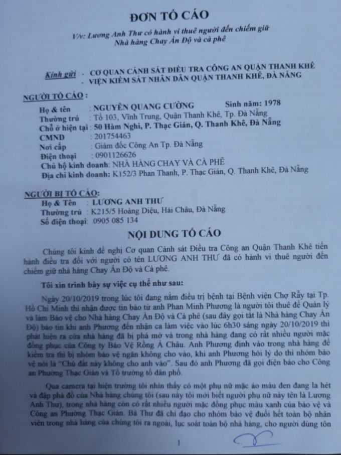 Sau một hồi nói chuyện qua lại, ông Phan Minh Phương - quản lý của quán và nhân viên được họ cho vào bên trong. Lúc này bà Lương Anh Thư (trú tại 215/5, đường Hoàng Diệu, quận Hải Châu, Đà Nẵng) nói: “Đất này là của tao, tao không cho ai vào đây hết” rồi có hành động đá đụng, chửi bới.