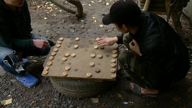 Những người di cư chơi cờ và uống trà. Ảnh: BBC.