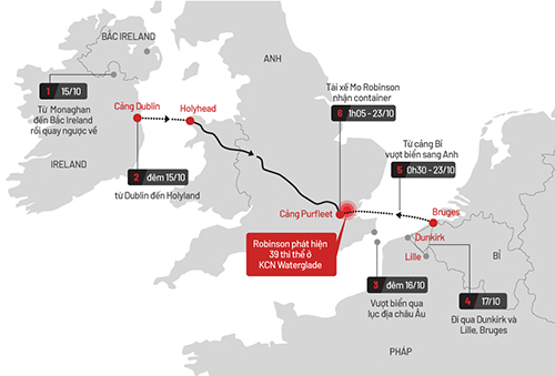 Thùng container sau đó đi từ cảng Dublin đến Holyhead ở phía bắc xứ Wales đêm đó, rồi vượt biển qua lục địa châu Âu vào tối 16/10. Nó tiếp tục đi qua các thành phố Dunkirk và Lille của Pháp, cùng thành phố Bruges của Bỉ. Dunkirk nổi tiếng là nơi những kẻ buôn người săn lùng những người di cư đang t́m cách vượt eo biển Manche sang Anh.
