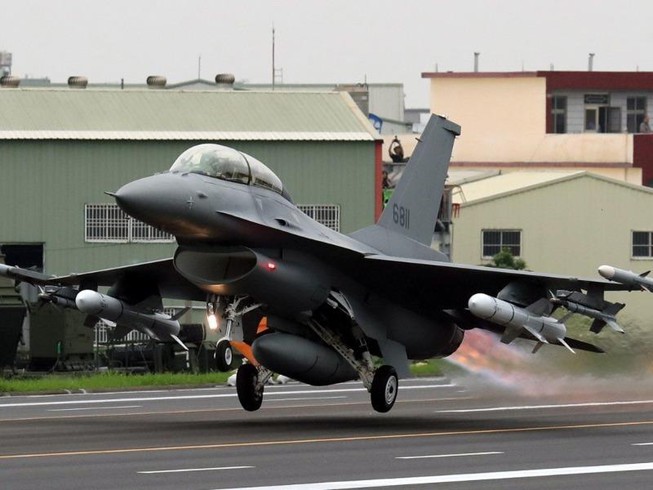 Một chiếc máy bay chiến đấu F-16V cất cánh trong một cuộc tập trận ở Đài Loan. Ảnh: EPA