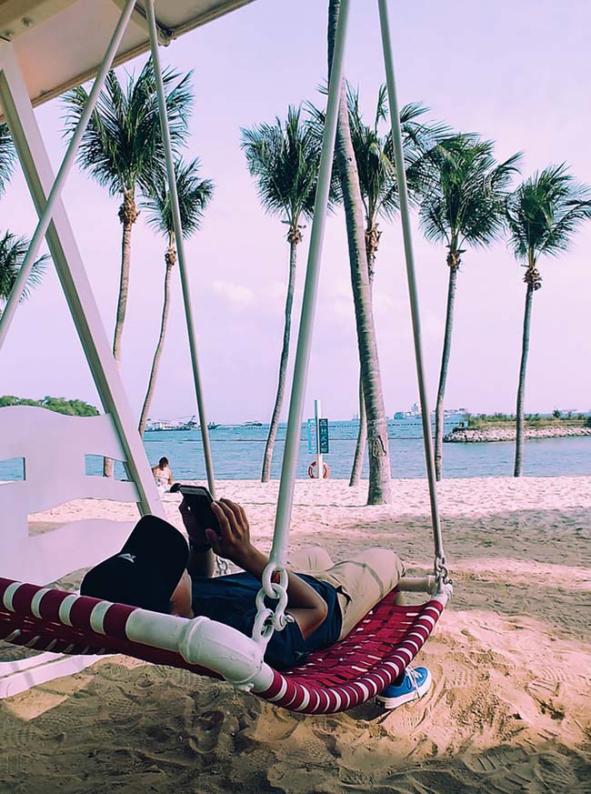 Vườn rộng, hoa cỏ thênh thang, cây cối xanh tươi, nhưng… chưa hết đâu! Ở trung tâm mũi phía Nam của đảo Sentosa, bãi biển Palawan khéo léo hòa trộn biển xanh - cát trắng - trời xanh - nắng vàng và một chiếc cầu treo dẫn du khách sang một hòn đảo nhỏ.