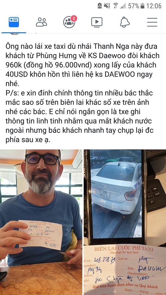 Theo đó, nội dung đăng tải như sau: “Ông nào lái xe taxi dù nhái Thanh Nga này đưa khách từ Phùng Hưng về khách sạn Daewoo đòi khách 960 nghìn đồng (đồng hồ 96.000vnd) xong lấy của khách 40USD”.